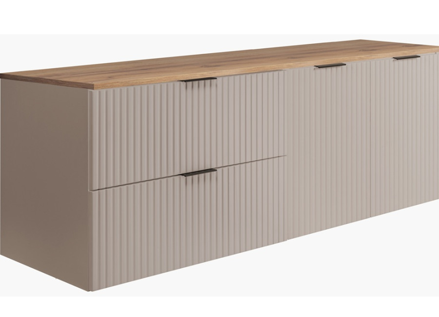 Farebné prevedenie kašmír spojené s teplým odtieňom dub craft zlatý vytvára prémiový béžový kúpeľňový nábytok, ktorý sa stane centrom pozornosti. Korpus je vyrobený z laminovanej drevotriesky s ABS hranami a predné plochy z MDF materiálu sú elegantne zdobené zvislým drážkovaním. Vďaka závesnému prevedeniu celá skrinka pôsobí ľahko a uľahčuje upratovanie podlahy.
