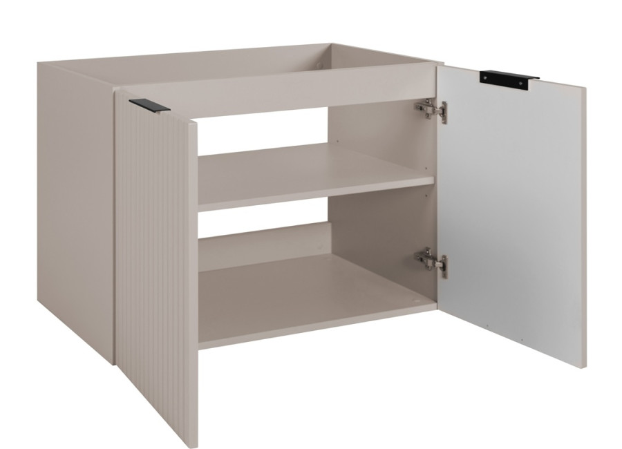 Kvalitné skrinky, odolné voči vlhkosti, sú kľúčové v kúpeľňovom prostredí. Preto je skrinka vyrobená z laminovanej drevotriesky s ABS hranami, zatiaľ čo predné plochy z MDF materiálu sú zdobené elegantným zvislým drážkovaním. Farebné prevedenie kašmír doplnené o teplý dekor dub craft zlatý vytvára béžový kúpeľňový nábytok, ktorý vizuálne obohatí každú kúpeľňu.