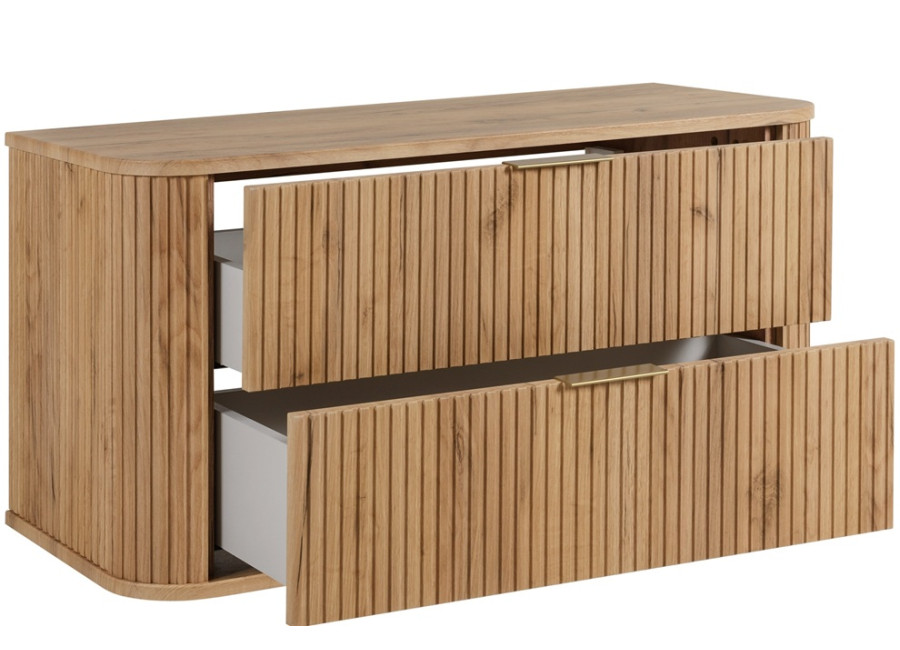 Skrinka pod umývadlo ELEGANCE v šírke 100 cm je skvostným doplnkom každého kúpeľňového nábytku. Vyrobená z kvalitnej laminovanej drevotriesky s ABS hranami, jej predné plochy a bočnice z MDF materiálu sú zdobené zvislým drážkovaním, čo pridáva kúpeľňovým skrinkám elegantný vzhľad. Zaoblený tvar tejto závesnej skrinky v kombinácii s farebným prevedením dub craft zlatý prináša do priestoru teplo a štýl. V balení nájdete dve sady úchytiek: čiernu matnú a lesklú zlatú, čo umožňuje dokonale zladiť skrinku s farbou batérie alebo inými kúpeľňovými doplnkami.