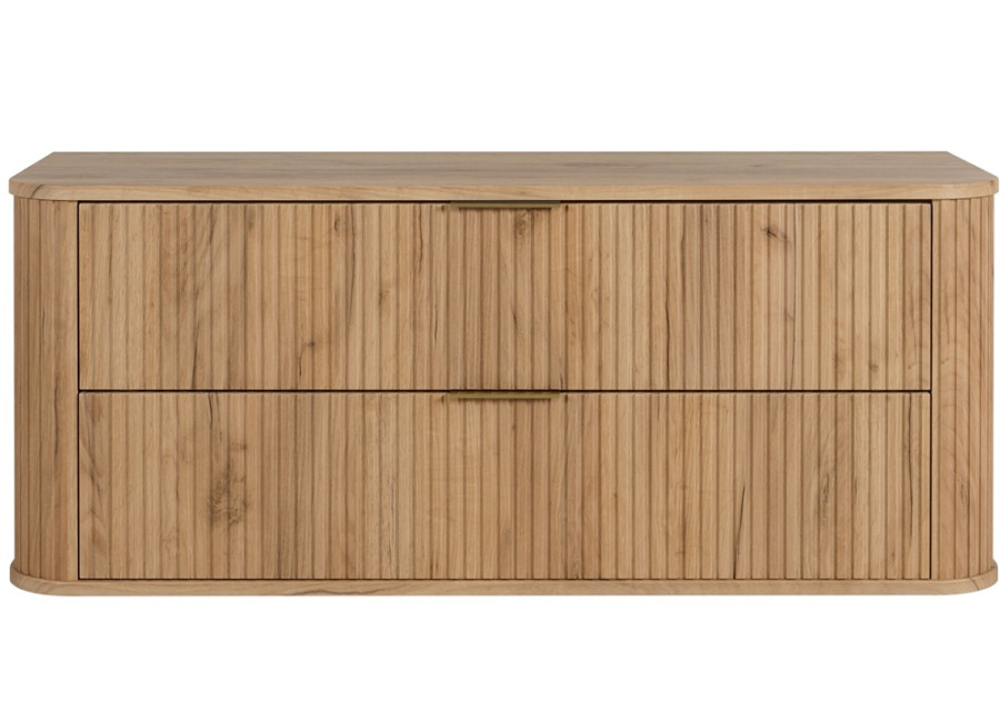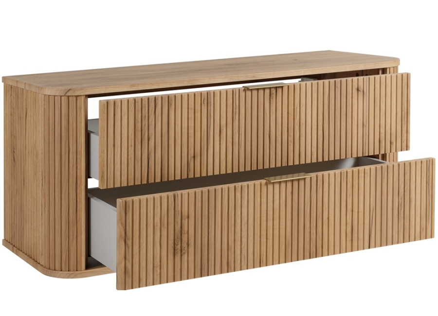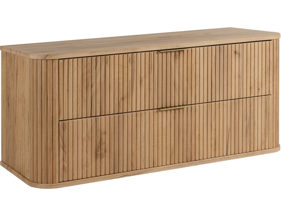 Skrinka pod umývadlo ELEGANCE v šírke 120 cm je skvostným doplnkom každého kúpeľňového nábytku. Vyrobená z kvalitnej laminovanej drevotriesky s ABS hranami, jej predné plochy a bočnice z MDF materiálu sú zdobené zvislým drážkovaním, čo pridáva kúpeľňovým skrinkám elegantný vzhľad. Zaoblený tvar tejto závesnej skrinky v kombinácii s farebným prevedením dub craft zlatý prináša do priestoru teplo a štýl. V balení nájdete dve sady úchytiek: čiernu matnú a lesklú zlatú, čo umožňuje dokonale zladiť skrinku s farbou batérie alebo inými kúpeľňovými doplnkami.
