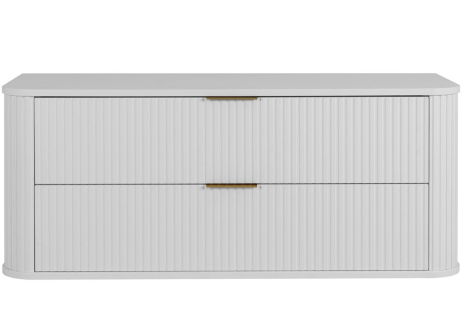 Skrinka pod umývadlo ELEGANCE v šírke 120 cm predstavuje ideálne riešenie pre tých, ktorí si želajú kombináciu estetiky a funkčnosti v kúpeľňovom nábytku. Vyrobená je z laminovanej drevotriesky s ABS hranami, jej predné plochy a bočnice sú z MDF materiálu, zdobené zvislým drážkovaním. Zaoblený tvar skrinky v decentnom bielom matnom prevedení zapadne do akéhokoľvek kúpeľňového prostredia. Je závesná na stenu, čím šetrí priestor a ponecháva kúpeľňu vzdušnou a ľahko udržiavateľnou. V balení nájdete dve sady úchytiek: čiernu matnú a lesklú zlatú, ktoré môžete elegantne zladit s farbou batérie alebo inými kúpeľňovými doplnkami.