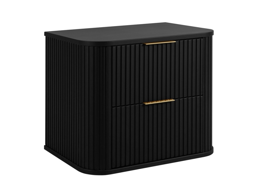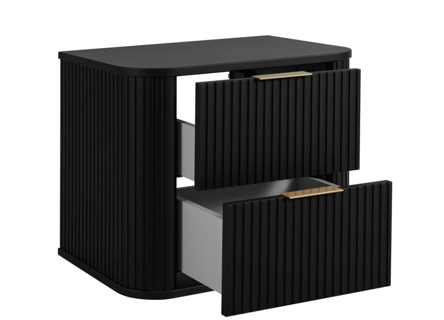 Elegantná čierna závesná skrinka pod umývadlo ELEGANCE B60 s vrchnou doskou je ideálnou voľbou pre milovníkov moderných čiernych kúpeľní. Táto skrinka splní všetky Vaše očakávania týkajúce sa štýlového a funkčného čierneho nábytku do kúpeľne. Je navrhnutá tak, aby dokonale zapadla do konceptu tmavých kúpeľní, pričom jej oválny tvar pridáva na jedinečnosti. Vyrobená je z kvalitnej laminovanej drevotriesky a MDF materiálu s hrúbkou 16 mm. Zvislé drážky na korpuse a čielkach zásuvky pridávajú skrinke jemný a elegantný vzhľad. Zásuvky sú vybavené technológiou Soft Close pre tiché dovieranie, čo zaručuje maximálny komfort pri každodennom používaní.
