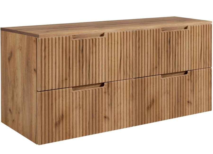 Kúpeľňová skrinka VENA C120DC je súčasťou ucelenej kolekcie nábytku do kúpeľne vo farebnom prevedení dub craft zlatý. Ide o skrinku pod umývadlo v šírke 120 cm, ktorá sa skladá z dvoch samostatných skriniek šírky 60 cm a vrchnej dosky s celkovou dĺžkou 120 cm. Každá zo skriniek je vyrobená z laminovanej drevotriesky s ABS hranami, predné plochy sú z MDF materiálu a zdobené zvislým drážkovaním. Zásuvky sú vybavené systémom tichého dovierania a ich dizajn dopĺňajú zafrézované úchytky, ktoré nenarúšajú hladký povrch nábytku. Vnútorné časti zásuviek majú svetlosivú farbu.