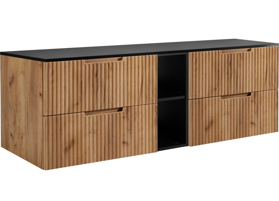 Ide o závesný nábytok do kúpeľne, ktorý pôsobí odľahčene a zároveň prakticky umožňuje ľahkú údržbu priestoru pod skrinkou. Korpus je vyrobený z laminovanej drevotriesky s ABS hranami, predné čelá sú z MDF materiálu so zvislým drážkovaním, ktoré dodáva nábytku decentnú štruktúru a jednotný vzhľad. Zásuvky sú vybavené funkciou tichého dovierania pre komfortné každodenné používanie. Zafrézované úchytky zabezpečujú jednoduchú manipuláciu a nenarúšajú čistý dizajn. Farebné prevedenie dub craft zlatý pôsobí prirodzene a teplo, vnútorné časti zásuviek sú v svetlosivej farbe. Pre plné využitie priestoru v hornej zásuvke odporúčame zakúpiť plochý sifón, ktorý nebude obmedzovať vnútornú kapacitu.