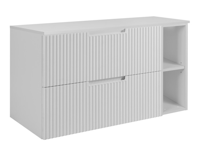 Nábytok do kúpeľne z kolekcie VENA je vyrobený z laminovanej drevotriesky s ABS hranami, ktoré zaručujú zvýšenú odolnosť voči vlhkosti. Predné plochy pozostávajú z MDF materiálu a sú zdobené zvislým drážkovaním, čo dodáva nábytku modernú štruktúru. Zafrézované úchytky dopĺňajú minimalistický vzhľad. Farebné prevedenie biela matná pôsobí neutrálne a elegantne, zatiaľ čo vnútorné časti zásuviek v svetlosivej farbe zabezpečujú prehľadnosť uložených vecí. Zásuvky sú vybavené mechanizmom tichého dovierania. Pre efektívne využitie hornej zásuvky odporúčame zakúpiť plochý sifón.