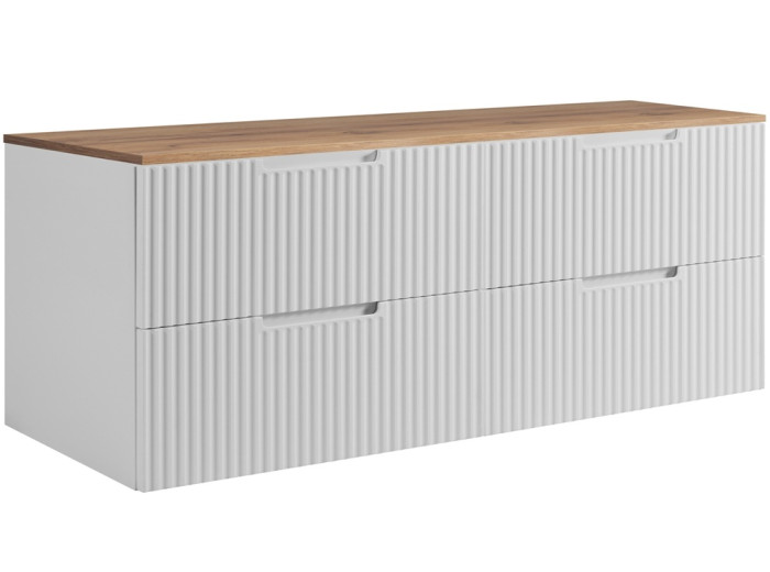 Použitý materiál je laminovaná drevotrieska s ABS hranami, ktoré zvyšujú odolnosťou voči vlhkosti. Predné plochy z MDF materiálu sú zdobené jemným zvislým drážkovaním, čím dodávajú skrinke elegantný nádych. Farebné prevedenie v bielej matnej farbe dodáva čistý a moderný vzhľad, vnútorné časti zásuviek sú v svetlosivej farbe, čo prispieva k prehľadnosti uloženej kozmetiky, uterákov či iných hygienických potrieb. Zásuvky sú vybavené mechanizmom tichého dovierania, čo zvyšuje pohodlie pri používaní. Pre efektívne využitie priestoru nad zásuvkami odporúčame ku skrinke zakúpiť plochý sifón, ktorý vám umožní využiť hornú zásuvku na maximum.