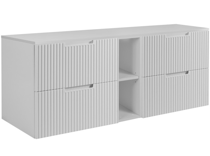 Skrinka je závesná na stenu, čo zjednodušuje údržbu a uchováva priestor vzdušný a moderný. Vyrobená je z laminovanej drevotriesky s ABS hranami, ktoré zabezpečujú dlhú životnosť nábytku aj v prostredí so zvýšenou vlhkosťou. Predné plochy sú z MDF materiálu a sú zdobené zvislým drážkovaním, čím dodávajú celkovému vzhľadu eleganciu. Farebné prevedenie v bielej matnej farbe je vhodné do všetkých druhov interiérov a dopĺňa ju svetlosivá farba vnútorných častí zásuviek, ktorá zabezpečuje prehľadnosť a ľahkú orientáciu medzi uloženými predmetmi. Bezproblémové otváranie umožňujú zafrézované úchytky, pričom zásuvky sú vybavené funkciou tichého dovierania, čo zvyšuje komfort pri každom použití.