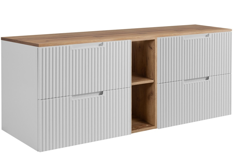 Skrinka je závesná na stenu, čo zjednodušuje údržbu a uchováva priestor vzdušný a moderný. Vyrobená je z laminovanej drevotriesky s ABS hranami, ktoré zabezpečujú dlhú životnosť nábytku aj v prostredí so zvýšenou vlhkosťou. Predné plochy sú z MDF materiálu a sú zdobené zvislým drážkovaním, čím dodávajú celkovému vzhľadu eleganciu. Farebné prevedenie v bielej matnej farbe je vhodné do všetkých druhov interiérov a dopĺňa ju svetlosivá farba vnútorných častí zásuviek, ktorá zabezpečuje prehľadnosť a ľahkú orientáciu medzi uloženými predmetmi. Bezproblémové otváranie umožňujú zafrézované úchytky, pričom zásuvky sú vybavené funkciou tichého dovierania, čo zvyšuje komfort pri každom použití.