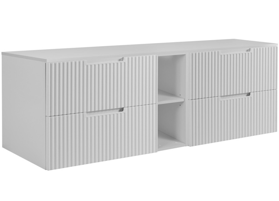 Tento dizajn umožňuje efektívne využitie úložného priestoru. Skrinka je závesná na stenu, čo prispieva k modernému a čistému vzhľadu kúpeľne a zabezpečuje ľahšie čistenie podlahy. Laminovaná drevotrieska s ABS hranami zaručuje vysokú odolnosť skrinky voči vlhkosti. Predné plochy z MDF materiálu, zdobené zvislým drážkovaním, dodávajú skrinke nádych elegancie a sú doplnené o praktické zafrézované úchytky. Biela matná farba je v kontraste so svetlosivými vnútornými plochami zásuviek, čo zvyšuje prehľadnosť umiestnených vecí. Zásuvky sú vybavené funkciou tichého dovierania.