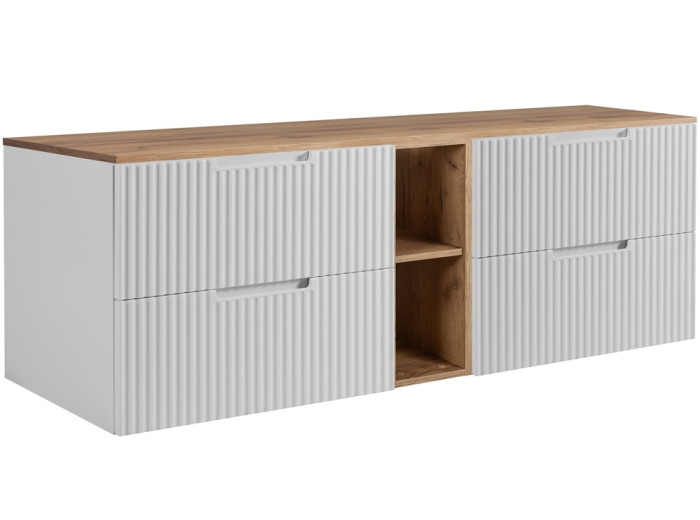 Tento dizajn umožňuje efektívne využitie úložného priestoru. Skrinka je závesná na stenu, čo prispieva k modernému a čistému vzhľadu kúpeľne a zabezpečuje ľahšie čistenie podlahy. Laminovaná drevotrieska s ABS hranami zaručuje vysokú odolnosť skrinky voči vlhkosti. Predné plochy z MDF materiálu, zdobené zvislým drážkovaním, dodávajú skrinke nádych elegancie a sú doplnené o praktické zafrézované úchytky. Biela matná farba je v kontraste so svetlosivými vnútornými plochami zásuviek, čo zvyšuje prehľadnosť umiestnených vecí. Zásuvky sú vybavené funkciou tichého dovierania.