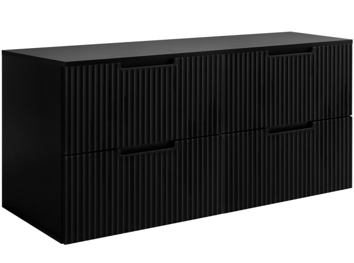Je vyrobená z laminovanej drevotriesky s ABS hranami, predné plochy z MDF materiálu sú zdobené zvislým drážkovaním. V ponuke je vo farebnom prevedení čierna matná, vnútorné časti zásuviek sú v svetlosivej farbe. Zafrézované úchytky podčiarkujú čistý dizajn. Skrinka je závesná na stenu, čo uľahčuje čistenie podlahy. Zásuvky vybavené funkciou tichého dovierania zvyšujú každodenný komfort používania. Skrinka do kúpeľne poskytuje dostatočný priestor pre uloženie kozmetiky, uterákov či drobných čistiacich prostriedkov. Ku skrinke pod umývadlo odporúčame zakúpiť plochý sifón, ktorý Vám umožní využiť hornú zásuvku na maximum.