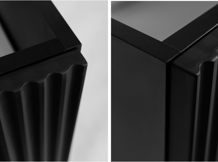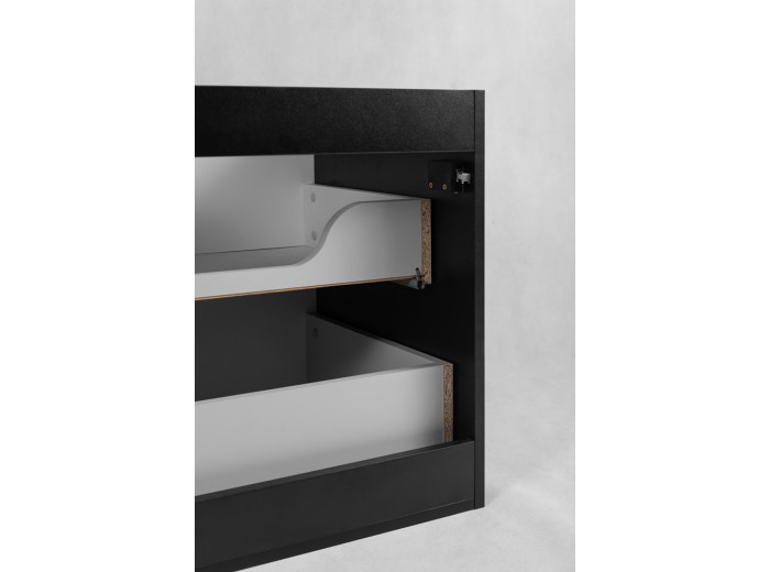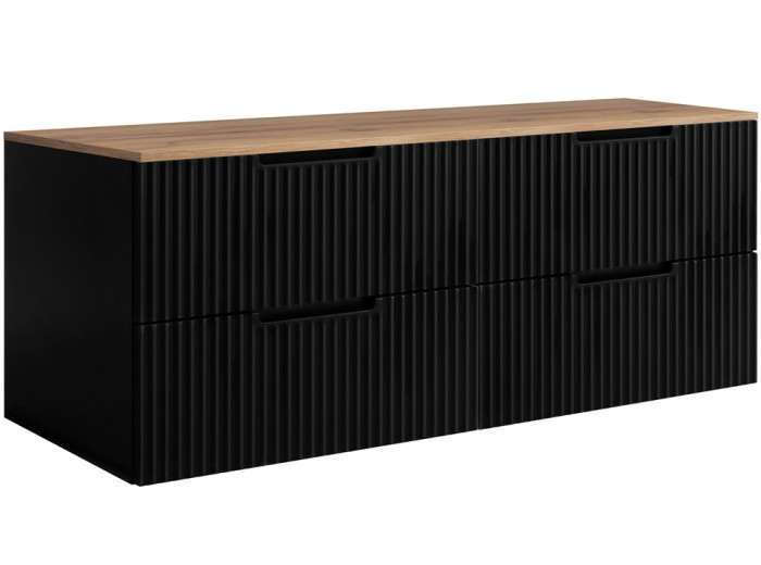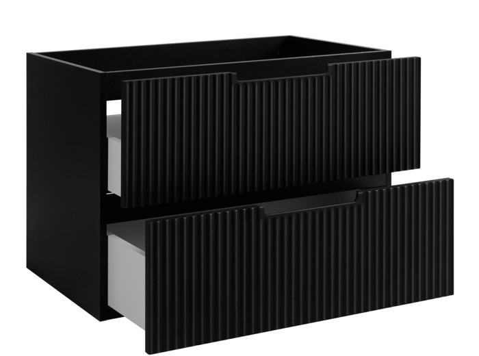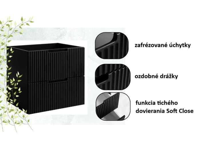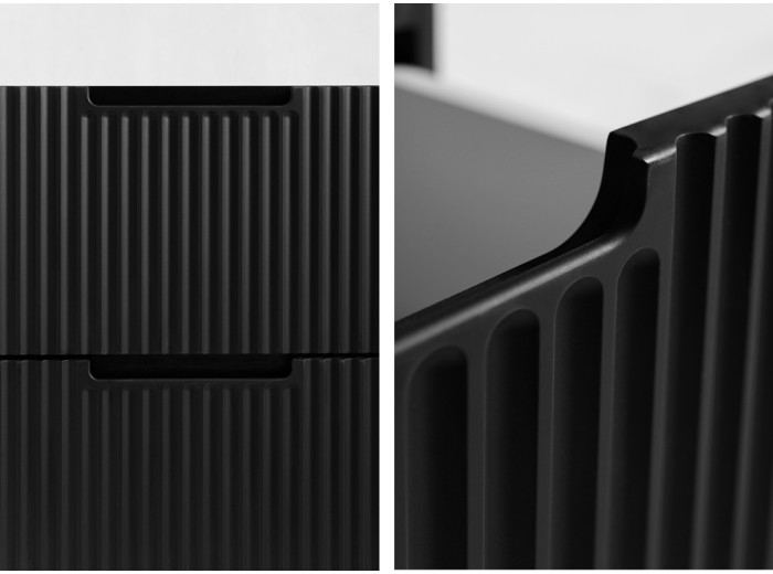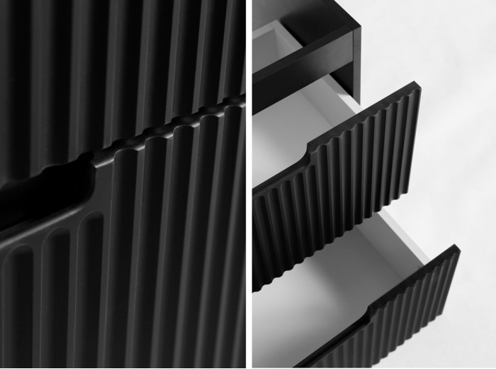 Vďaka tomu poskytuje rozsiahlu plochu pre umývadlá a odkladanie. Je vyrobená z laminovanej drevotriesky s ABS hranami, jej predné plochy sú z kvalitného MDF materiálu, zdobené zvislým drážkovaním v čiernej matnej farbe, zatiaľ čo vnútorné časti zásuviek sú v svetlosivom prevedení.