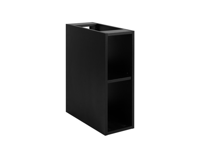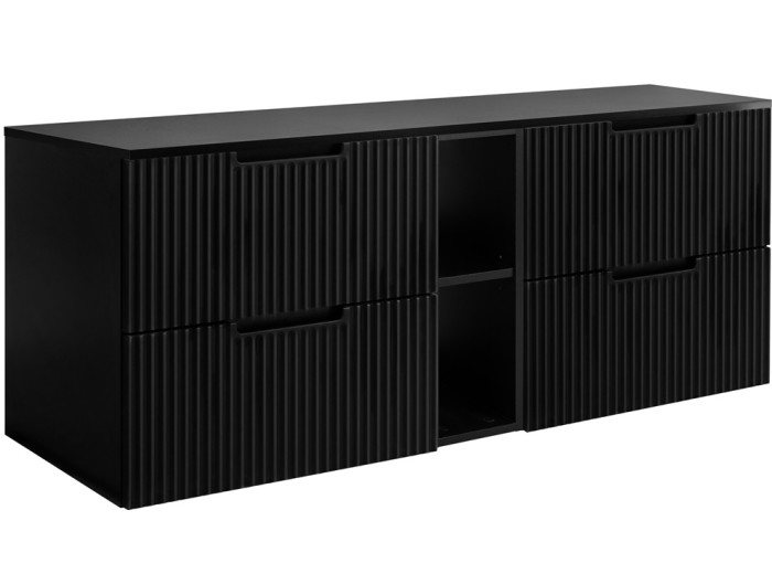 Všetky predné plochy sú z MDF materiálu a zdobené zvislým drážkovaním, čo v kombinácii s čiernym matným prevedením dodáva kúpeľni hĺbku a moderný charakter. Vnútorné časti zásuviek sú v svetlosivej farbe. Skrinka je vyrobená z laminovanej drevotriesky s ABS hranami a patrí medzi kvalitné skrinky, odolné voči vlhkosti. Zafrézované úchytky zaručujú čisté línie, zatiaľ čo zásuvky vybavené funkciou tichého dovierania poskytujú tichú manipuláciu. Ako závesná skrinka na stenu opticky zväčšuje priestor a uľahčuje upratovanie. Pre úplné využitie úložného priestoru odporúčame ku skrinke zakúpiť plochý sifón, ktorý Vám umožní využiť hornú zásuvku na maximum.