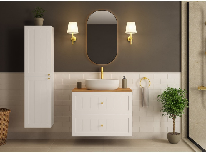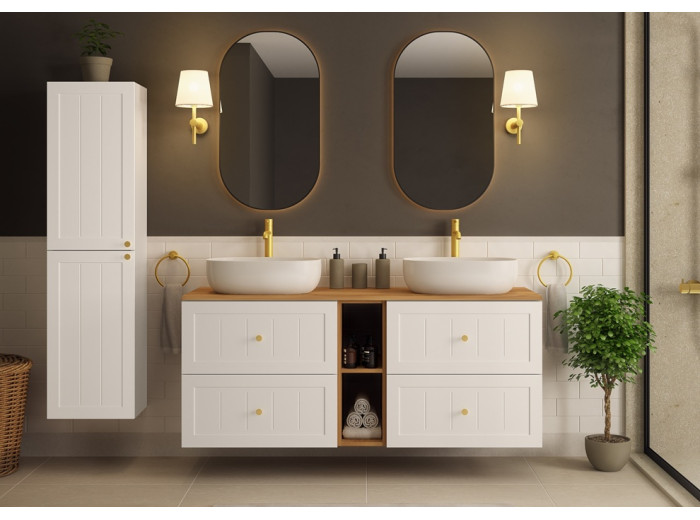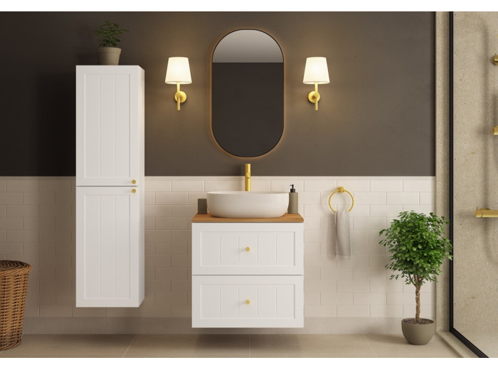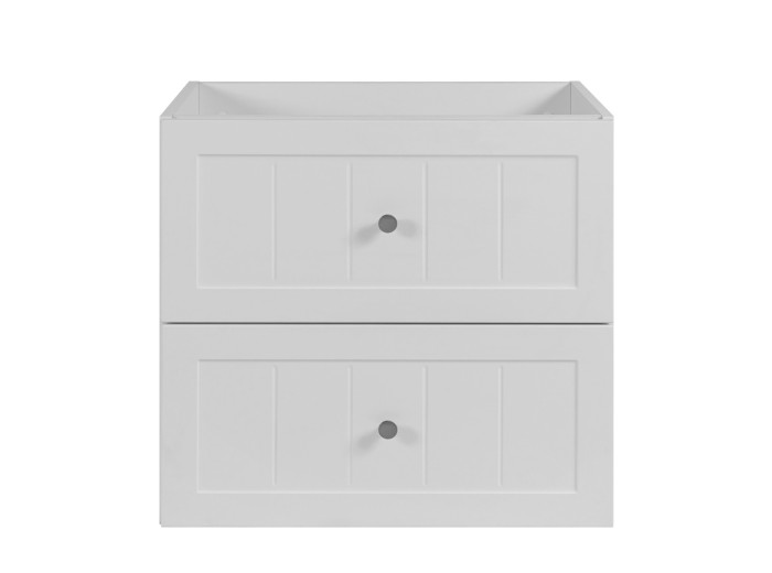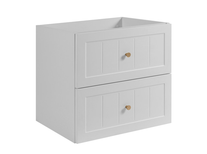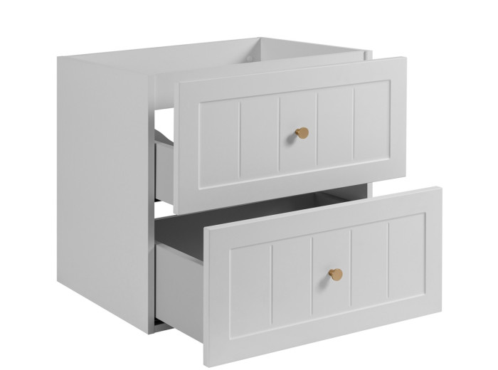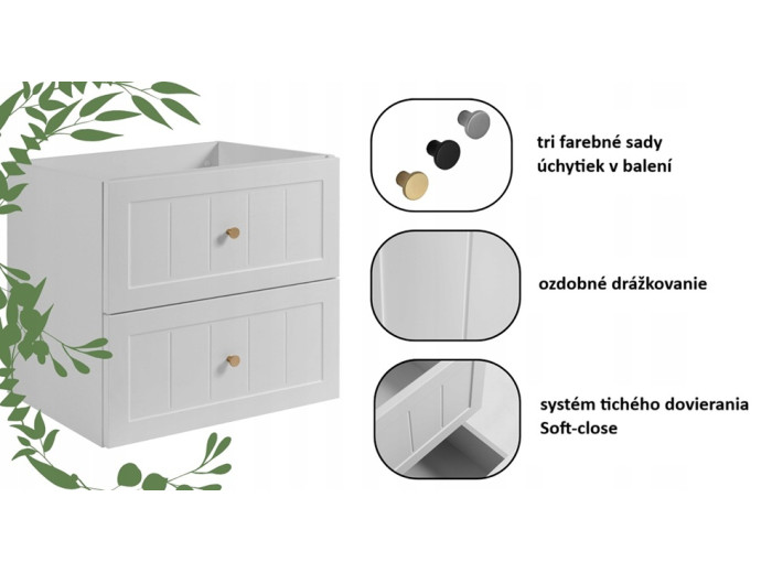 Skrinka pod umývadlo GUSTO biely W60 predstavuje ideálnu voľbu pre tých, ktorí hľadajú spojenie provensálskeho dizajnu a praktickosti do menšieho priestoru. Kúpeľňová skrinka je vyrobená vo farbe biela matná. Korpus je z laminovanej drevotriesky s ABS hranami, ktorý v kombinácii s prednými plochami z MDF materiálu zdobenými drážkovaním, vytvára elegantný vzhľad. Súčasťou balenia sú tri farebné sady úchytiek: čierna, zlatá a strieborná, ktoré môžete zladiť s farbou batérie alebo inými doplnkami. Vnútorné časti zásuviek sú v svetlosivej farbe.