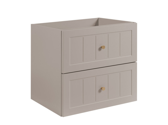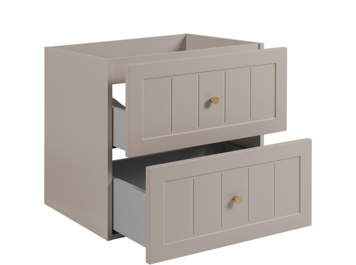 Skrinka pod umývadlo GUSTO kašmír K60 je ideálnym riešením pre každú modernú kúpeľňu. Svojimi rozmermi a šírkou 60 cm je prispôsobená pre menšie kúpeľne, kde efektívne využijete dostupný priestor. Skrinka do kúpeľne je vyrobená z laminovanej drevotriesky s ABS hranami, ktoré zvyšujú jej odolnosť voči vlhkosti, a predné plochy z MDF materiálu zdobené jemným drážkovaním. Farebné prevedenie kašmír so svetlosivými vnútornými časťami zásuviek dodáva skrinke jemný a moderný vzhľad.