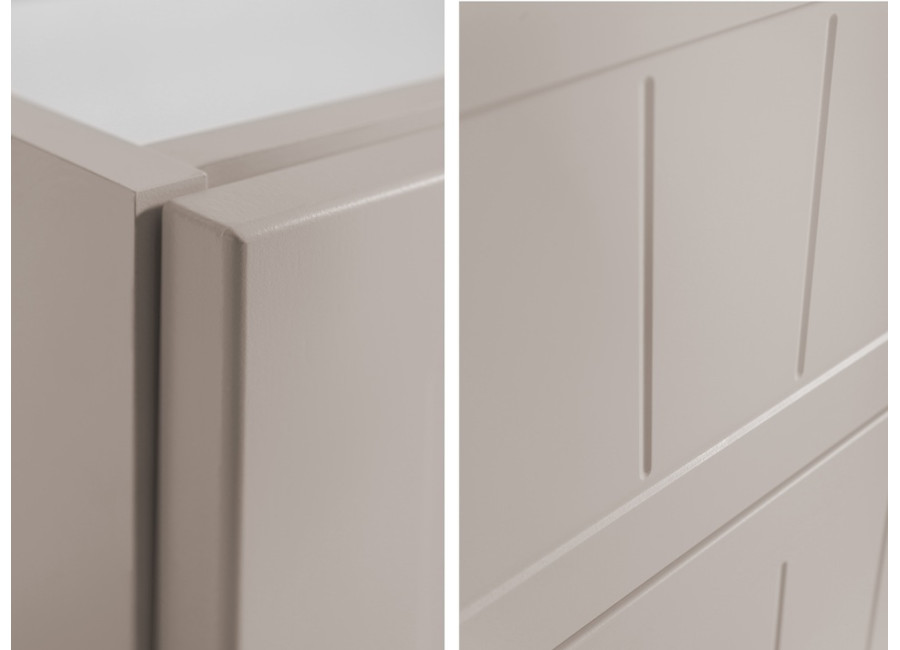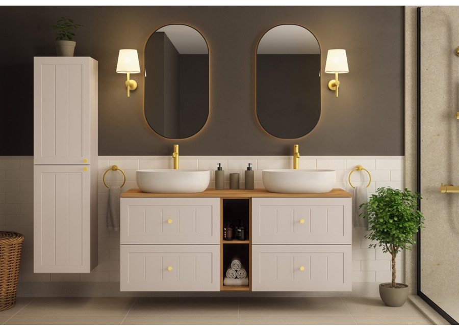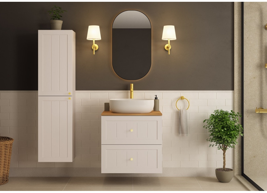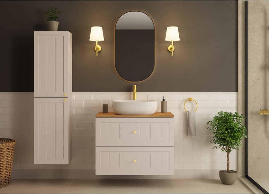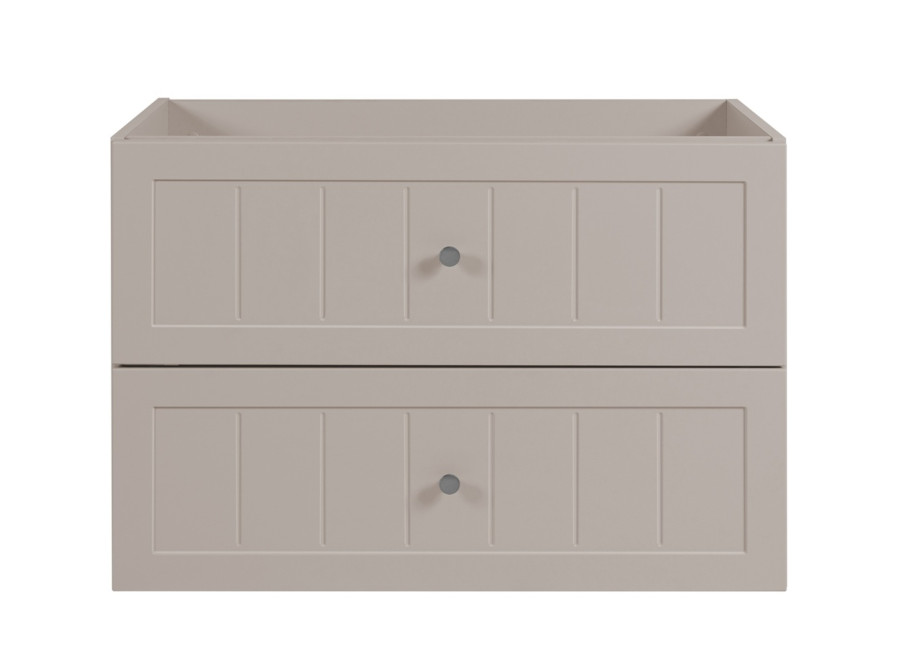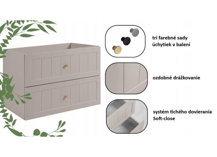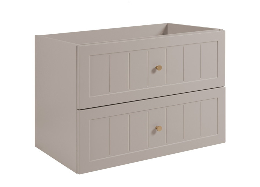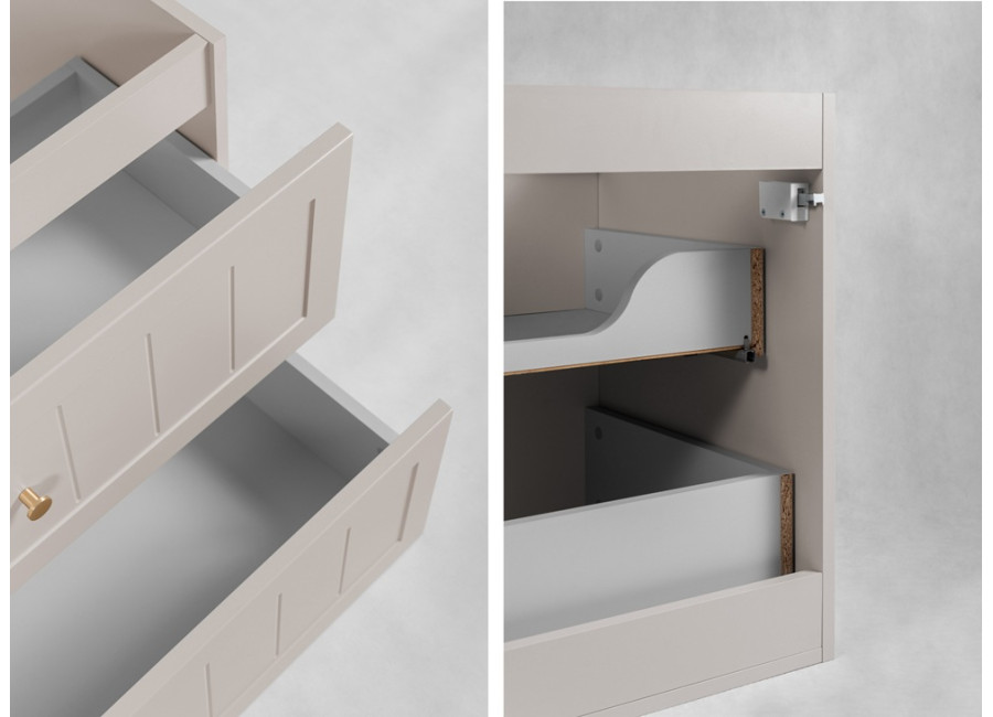 Skrinka pod umývadlo GUSTO kašmír K80 je ideálnym riešením pre každú modernú kúpeľňu. Svojimi rozmermi a šírkou 80 cm je prispôsobená pre menšie kúpeľne, kde efektívne využijete dostupný priestor. Skrinka do kúpeľne je vyrobená z laminovanej drevotriesky s ABS hranami, ktoré zvyšujú jej odolnosť voči vlhkosti, a predné plochy z MDF materiálu zdobené jemným drážkovaním. Farebné prevedenie kašmír so svetlosivými vnútornými časťami zásuviek dodáva skrinke jemný a moderný vzhľad.