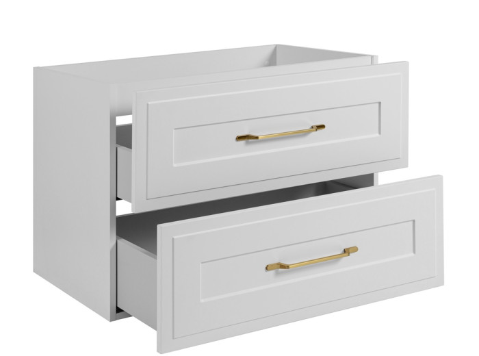 Celá konštrukcia je vyrobená z laminovanej drevotriesky s ABS hranami. Predné plochy z MDF materiálu sú zdobené jemným frézovaním, ktoré vystihuje tradičný charakter kolekcie. Zásuvky sú vybavené funkciou tichého dovierania. Súčasťou balenia sú úchytky v zlatej farbe, ktoré dávajú skrinke decentný klasický vzhľad a umožňujú ju zosúladiť s ostatnými doplnkami či batériami. Nábytok do kúpeľne poskytuje dostatočný priestor na uloženie uterákov, kozmetiky, drobných doplnkov aj čistiacich prostriedkov. Ku skrinke pod umývadlo odporúčame zakúpiť plochý sifón, vďaka ktorému možno využiť hornú zásuvku lepšie ako s klasickým sifónom.