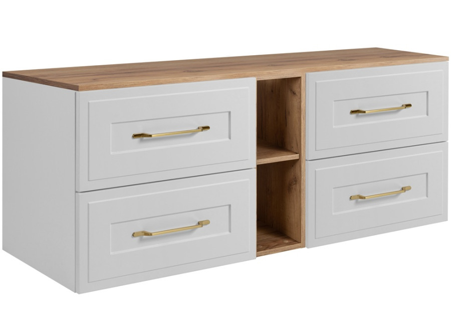 Skrinka je závesná na stenu, vďaka čomu pôsobí odľahčene a zároveň uľahčuje údržbu podlahy. Vyrobená je z laminovanej drevotriesky s ABS hranami, ktoré zvyšujú odolnosť voči vlhkosti. Predné plochy z MDF materiálu sú zdobené jemným frézovaním, ktoré podčiarkuje elegantný vzhľad. Farebné prevedenie biela matná/dub craft zlatý pôsobí čisto a univerzálne, pričom vnútorné časti zásuviek v svetlosivej farbe dodávajú zostave decentný kontrast. Zásuvky sú vybavené funkciou tichého dovierania. Súčasťou balenia sú úchytky v zlatej farbe, ktoré skrinke dodávajú jemný klasický akcent. Kúpeľňová skrinka poskytuje dostatok priestoru na uskladnenie uterákov, kozmetiky, doplnkov aj čistiacich prostriedkov. Ku skrinke pod umývadlo odporúčame zakúpiť plochý sifón, ktorý umožní plnohodnotne využiť hornú zásuvku.