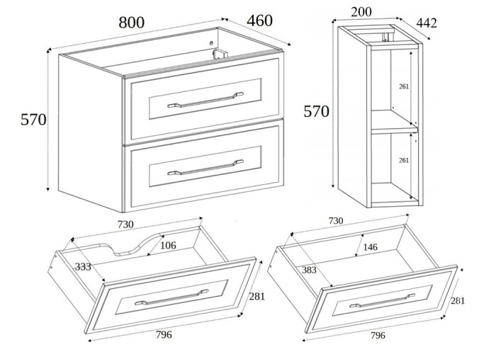 Je vyrobená z laminovanej drevotriesky s ABS hranami, predné plochy sú z MDF materiálu, zdobené frézovaním v tvare rámčeka. Vyrába sa v prevedení čierna matná, vnútorné časti zásuviek sú v svetlosivej farbe. Skrinka je závesná na stenu, vďaka čomu sa uľahčuje údržiava podlaha.