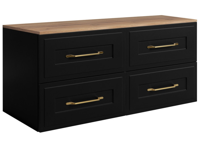 Skrinka pod umývadlo CLASSIC čierny B120DC je elegantným riešením pre vašu kúpeľňu, spájajúcim čierne kúpeľňové skrinky v klasickom štýle s praktickou funkčnosťou. Skrinka má šírku 120 cm a je zložená z dvoch 60 cm zásuvkových skriniek a jednej 120 cm vrchnej dosky. Celá konštrukcia je vyrobená z laminovanej drevotriesky s ABS hranami a predné plochy sú z MDF materiálu, zdobené jemným frézovaním v tvare rámčeka. Čierna matná/dub craft zlatý farba dodáva eleganciu, vnútorné časti zásuviek sú v svetlosivej farbe.