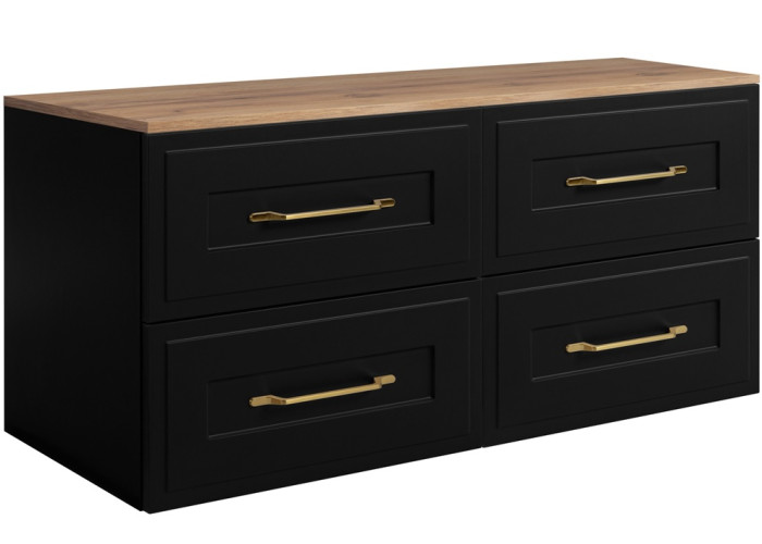 Skrinka pod umývadlo CLASSIC čierny B160DC patrí medzi čierne kúpeľňové skrinky v klasickom štýle. Kúpeľňová skrinka v šírke 160 cm sa skladá z troch častí: z dvoch 80 cm zásuvkových skriniek a 160 cm vrchnej dosky. Je vyrobená z laminovanej drevotriesky s ABS hranami, predné plochy z MDF materiálu zdobené frézovaním v tvare rámčeka. Farebné prevedenie je čierna matná/dub craft zlatý, vnútorné časti zásuviek sú v svetlosivej farbe. Úložný priestor je určený na každodenné potreby, do zásuviek pohodlne uložíte kozmetiku, drogériu, zubné kefky a pasty, holiace potreby, fén, kulmu či žehličku na vlasy, uteráky alebo zásoby hygienických potrieb.
