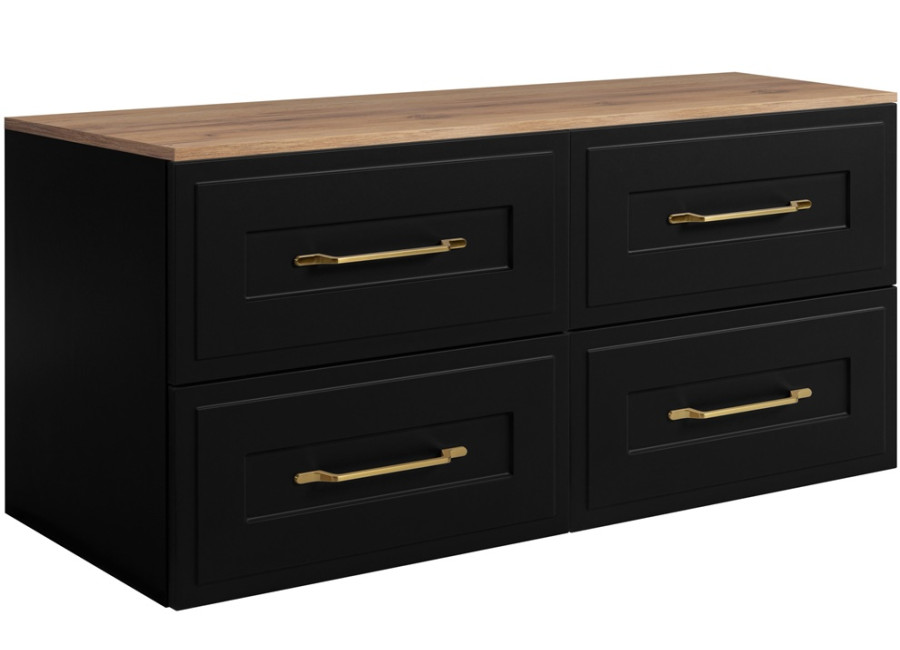 Skrinka pod umývadlo CLASSIC čierny B160DC patrí medzi čierne kúpeľňové skrinky v klasickom štýle. Kúpeľňová skrinka v šírke 160 cm sa skladá z troch častí: z dvoch 80 cm zásuvkových skriniek a 160 cm vrchnej dosky. Je vyrobená z laminovanej drevotriesky s ABS hranami, predné plochy z MDF materiálu zdobené frézovaním v tvare rámčeka. Farebné prevedenie je čierna matná/dub craft zlatý, vnútorné časti zásuviek sú v svetlosivej farbe. Úložný priestor je určený na každodenné potreby, do zásuviek pohodlne uložíte kozmetiku, drogériu, zubné kefky a pasty, holiace potreby, fén, kulmu či žehličku na vlasy, uteráky alebo zásoby hygienických potrieb.