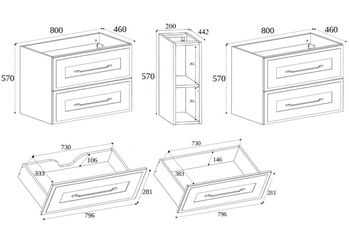 Je vyrobená z laminovanej drevotriesky s ABS hranami, predné plochy z MDF materiálu zdobené frézovaním v tvare rámčeka. Farebné prevedenie je čierna matná, vnútorné časti zásuviek sú v svetlosivej farbe. Skrinka je závesná na stenu, vďaka čomu zostáva podlaha voľná a údržba je výrazne jednoduchšia.