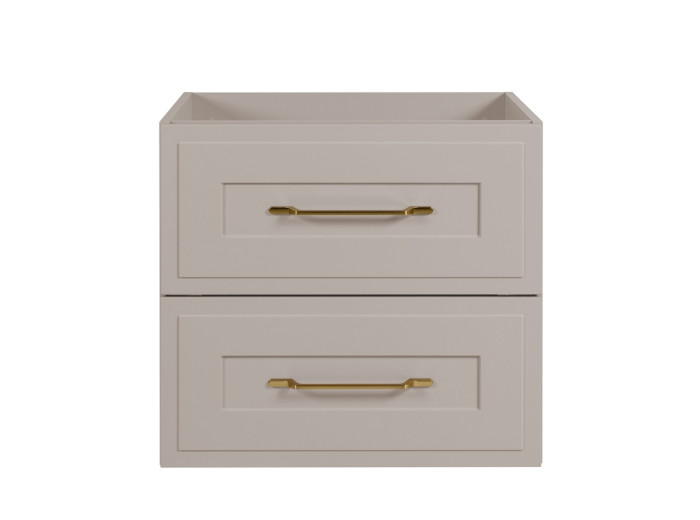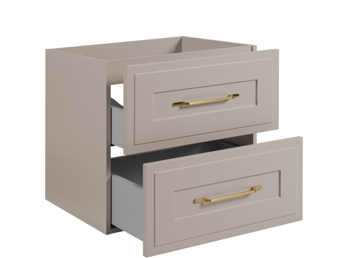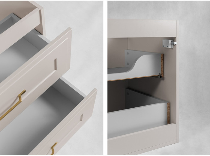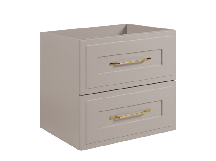Skrinka pod umývadlo CLASSIC kašmír K60 patrí medzi béžové kúpeľňové skrinky v klasickom štýle, ktoré si získavajú zákazníkov vďaka svojej nenápadnej elegancii a praktickému riešeniu úložného priestoru. Skrinka do kúpeľne v šírke 60 cm je vhodná pre menšie kúpeľne alebo toalety, kde je potrebné efektívne využiť každý kúsok priestoru. Korpus je vyrobený z laminovanej drevotriesky s ABS hranami, predné plochy z MDF materiálu zdobené frézovaním v tvare rámčeka. Súčasťou balenia sú úchytky v zlatej farbe, ktoré pekne kontrastujú s farebným prevedením kašmír a dodávajú skrinke noblesný vzhľad. Vnútorné časti zásuviek sú v svetlosivej farbe.