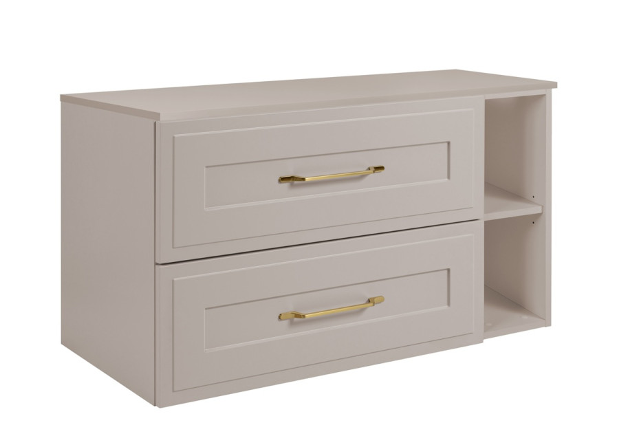 Patrí medzi béžové kúpeľňové skrinky v klasickom štýle, ktoré dokážu skĺbiť tradičný dizajn s modernými požiadavkami na funkčnosť. Celá zostava je vyrobená z laminovanej drevotriesky s ABS hranami, predné plochy sú z MDF materiálu zdobené frézovaním v tvare rámčeka. Farebné prevedenie je kašmír, vnútorné časti zásuviek sú v svetlosivej farbe, čo vytvára príjemný kontrast. Súčasťou balenia sú úchytky v zlatej farbe, ktoré dotvárajú elegantný celok. Skrinka je závesná na stenu, čo vám umožní pohodlne udržiavať čistotu pod nábytkom. Zásuvky vybavené funkciou tichého dovierania zabezpečujú komfortné používanie.