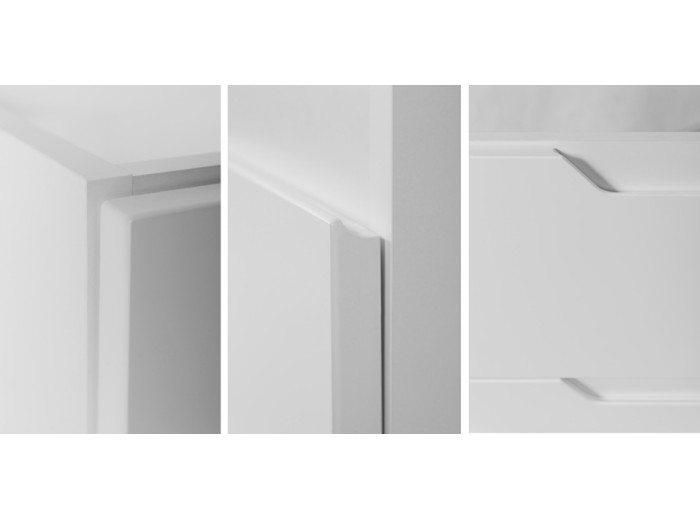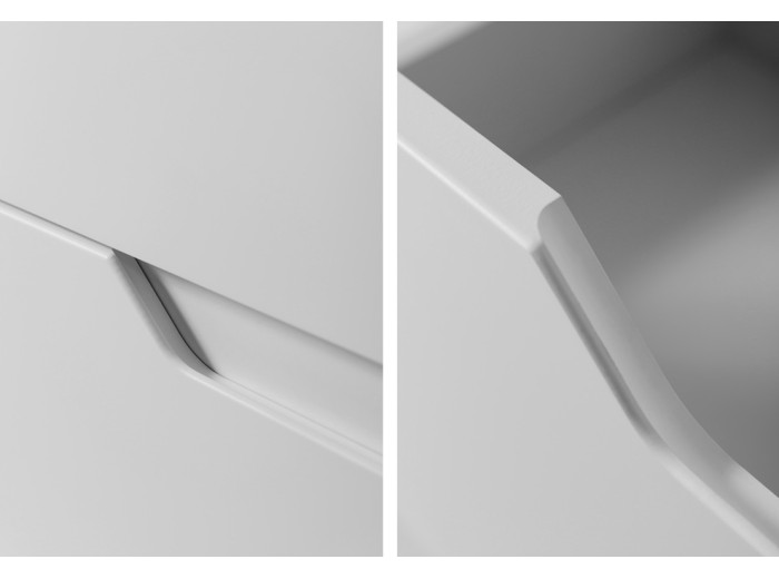 Skrinka pod umývadlo MODERN biely W60 má šírku 60 cm a je vyrobená z laminovanej drevotriesky s ABS hranami, ktoré zvyšujú jej odolnosť voči vlhkosti. Hladké predné plochy z MDF materiálu sú doplnené zafrézovanými úchytkami na pravej strane zásuviek, čo poskytuje moderný a štýlový vzhľad. Celkové farebné prevedenie je biela matná, ktoré ladí s akýmkoľvek interiérovým štýlom, zatiaľ čo vnútorné časti zásuviek sú v kontrastnej svetlosivej farbe.