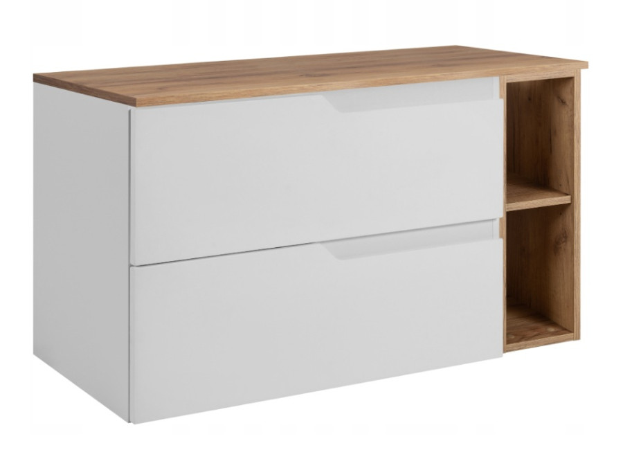 Skrinka je vyrobená z laminovanej drevotriesky s ABS hranami, predné plochy sú z hladkého MDF materiálu. Zafrézované úchytky umiestnené na pravej strane zásuviek podčiarkujú jednoduchosť línie nábytku. Povrchové prevedenie je v bielej matnej/dub craft zlatý, vnútorné časti zásuviek sú v svetlosivej farbe, čo dodáva skrinke jemný kontrast. Skrinka je závesná na stenu a zásuvky sú vybavené funkciou tichého dovierania, ktoré prispieva k pohodliu pri každodennom používaní. Ku skrinke pod umývadlo je vhodné dokúpiť plochý sifón, aby ste mohli využiť hornú zásuvku vo väčšom rozsahu.