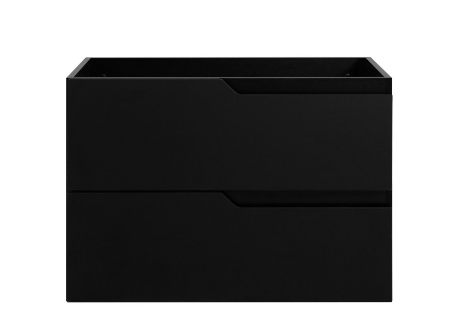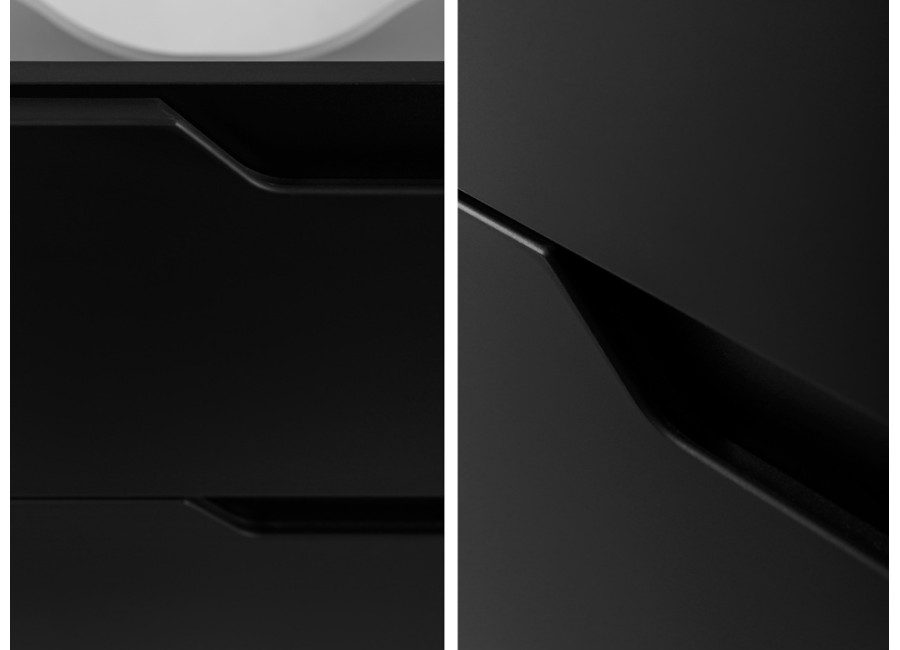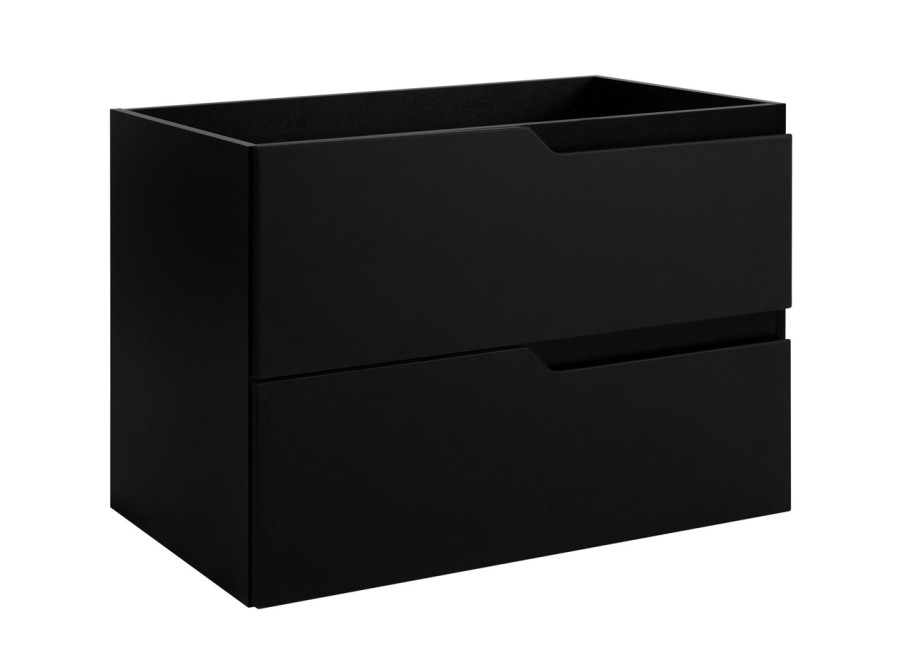 Skrinka pod umývadlo MODERN čierny B80 patrí medzi kúpeľňové skrinky v modernom dizajne v šírke 80 cm a ponúka úložný priestor pre bežné kúpeľňové potreby. Korpus je vyrobený z laminovanej drevotriesky s ABS hranami, ktoré zvyšujú odolnosť voči vlhkosti. Hladké predné plochy z MDF materiálu pôsobia jednoducho a v kombinácii so zafrézovanými úchytkami na pravej strane zásuviek vytvárajú ucelený vzhľad. Farebné prevedenie je čierna matná, vnútorné časti zásuviek sú v svetlosivej farbe. Skrinka je konštruovaná ako závesná na stenu, uľahčuje tak upratovanie podlahy.