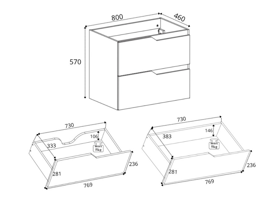 Dve zásuvky sú vybavené funkciou tichého dovierania, ktorá prispieva k pohodlenému používaniu. Do zásuviek si zákazník môže uložiť každodennú kozmetiku, kefky, krémy, menšie uteráky alebo ďalšie drobnosti. Ku skrinke pod umývadlo odporúčame zakúpiť plochý sifón, ktorý umožní využiť úložný priestor na maximum.