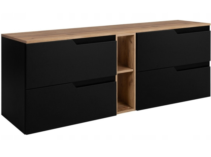 Korpus je vyrobený z laminovanej drevotriesky s ABS hranami, ktoré zvyšujú odolnosť voči vlhkosti. Predná časť je tvorená hladkými plochami z MDF materiálu, doplnenými o zafrézované úchytky na pravej strane zásuviek, ktoré dávajú skrinke čistý a nenápadný vzhľad. Celok pôsobí elegantne vďaka farebnému prevedeniu čierna matná, pričom vnútorné časti zásuviek sú v svetlosivej farbe.