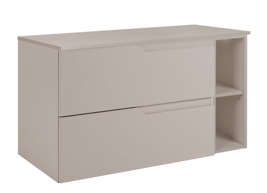 Vyrobená je z laminovanej drevotriesky s ABS hranami a jej hladké predné plochy z MDF materiálu pôsobia čisto a jednoducho. Farebné prevedenie je kašmír, pričom vnútorné časti zásuviek sú v svetlosivej farbe. Skrinka je závesná na stenu, zásuvky majú zafrézované úchytky na pravej strane a sú vybavené funkciou tichého dovierania.