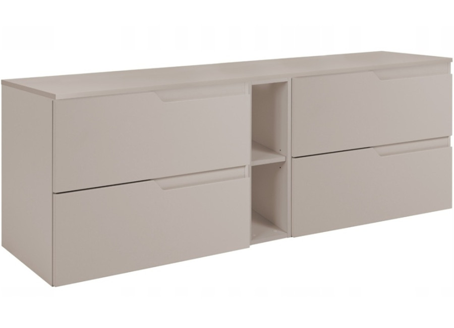 Béžová skrinka pod umývadlo v šírke 140 cm patrí medzi kúpeľňové skrinky v modernom dizajne a ponúka praktické riešenie pre väčšie kúpeľne. Skladá sa zo štyroch častí: