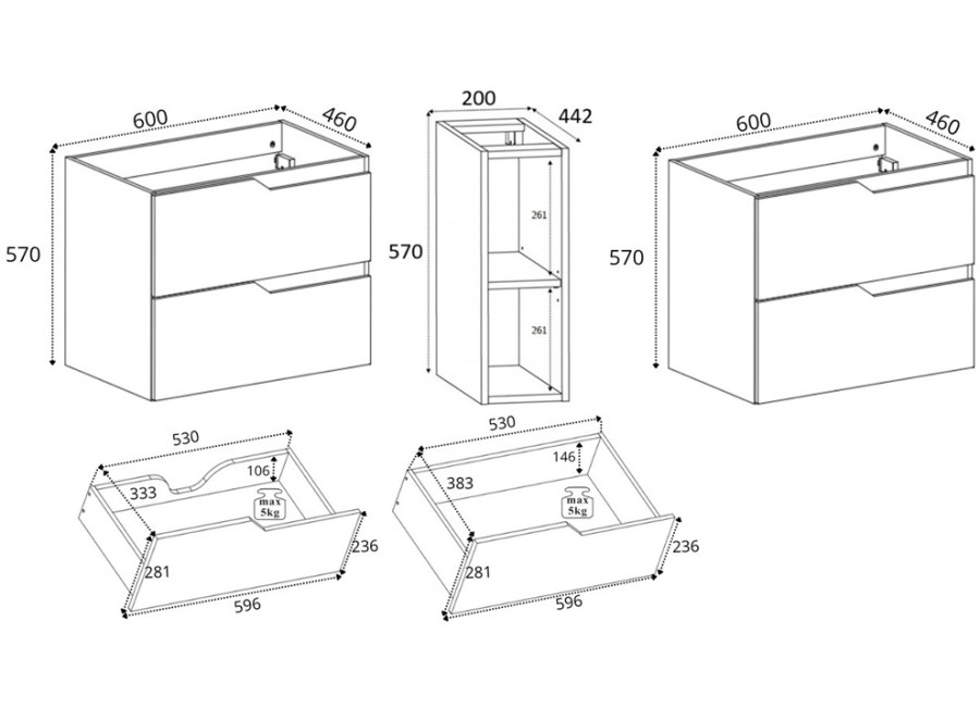 Vďaka rozdeleniu na zásuvkové skrinky a policový regál poskytuje dostatok miesta na hygienické potreby, kozmetiku, menšie uteráky aj ďalšie predmety, ktoré je potrebné mať uložené pri umývadle. Zásuvky udržiavajú veci prehľadne uložené a policový regál umožňuje rýchly prístup k najpoužívanejším doplnkom. Ku skrinke odporúčame zakúpiť plochý sifón, ktorý Vám umožní lepšie využiť hornú zásuvku.