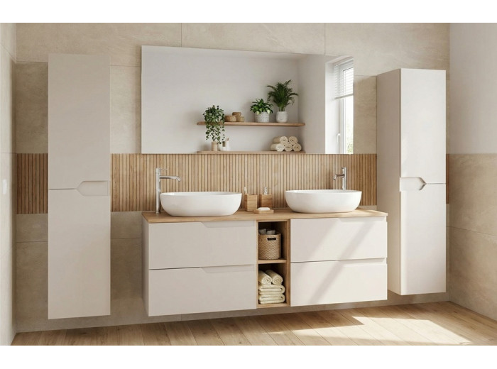 Kašmírová skrinka do kúpeľne v šírke 180 cm patrí medzi skrinky pod umývadlo v modernom dizajne a ponúka praktické riešenie pre väčšie kúpeľne. Skladá sa zo štyroch častí: