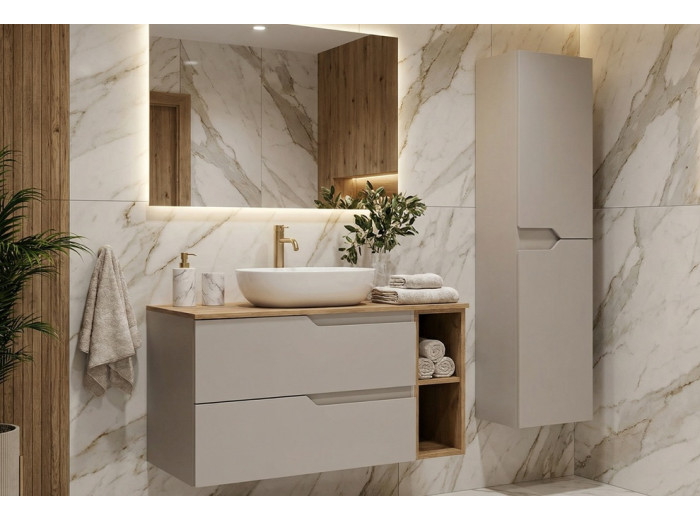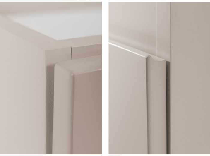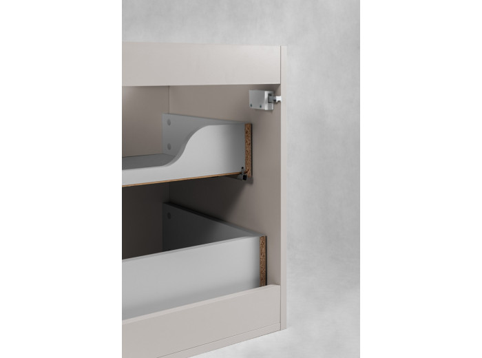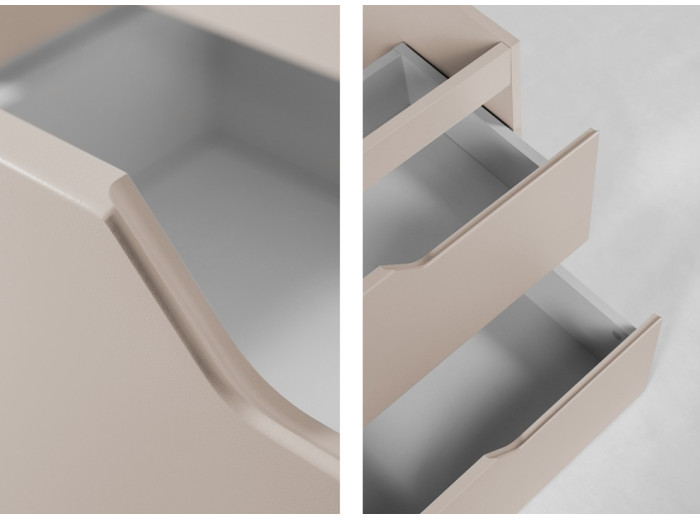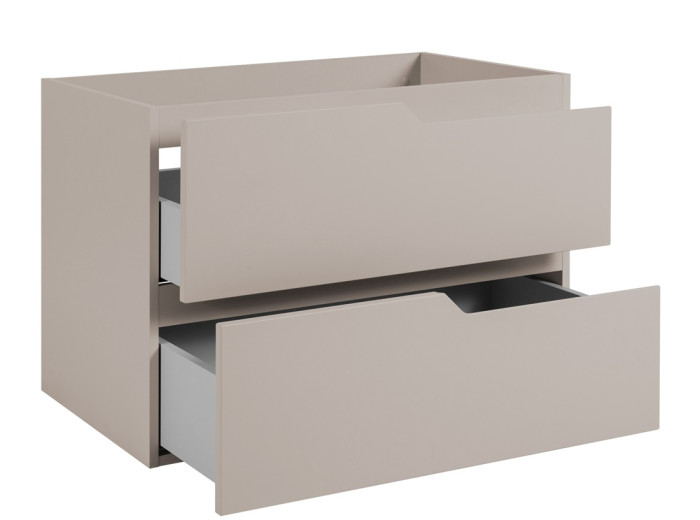 Je vyrobená z laminovanej drevotriesky s ABS hranami a jej hladké predné plochy z MDF materiálu pôsobia čisto a jednoducho. Farebné prevedenie je kašmír, pričom vnútorné časti zásuviek sú v svetlosivej farbe. Skrinka je závesná na stenu, zásuvky majú zafrézované úchytky na pravej strane a sú vybavené funkciou tichého dovierania.