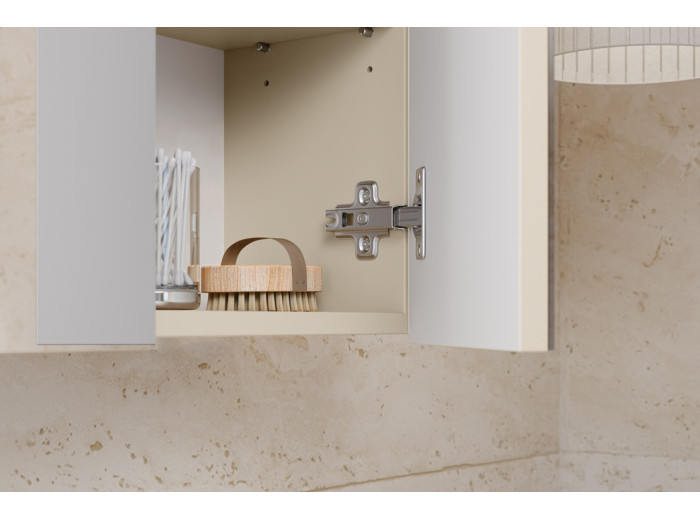 Dvoje dvierka sú vybavené funkciou tichého zatvárania. Skrinka so zrkadlom je navrhnutá tak, aby vytvorila harmonický celok so zvyškom kolekcie BALI, ktorá obsahuje skrinky pod umývadlo, vysoké skrinky a závesné skrinky do kúpeľne.