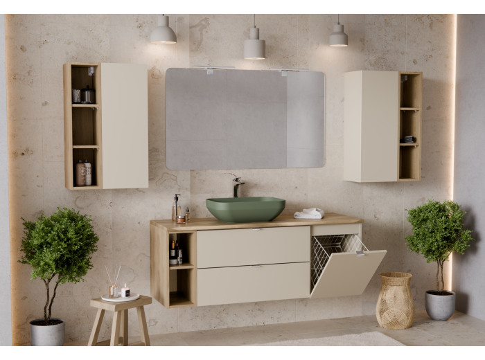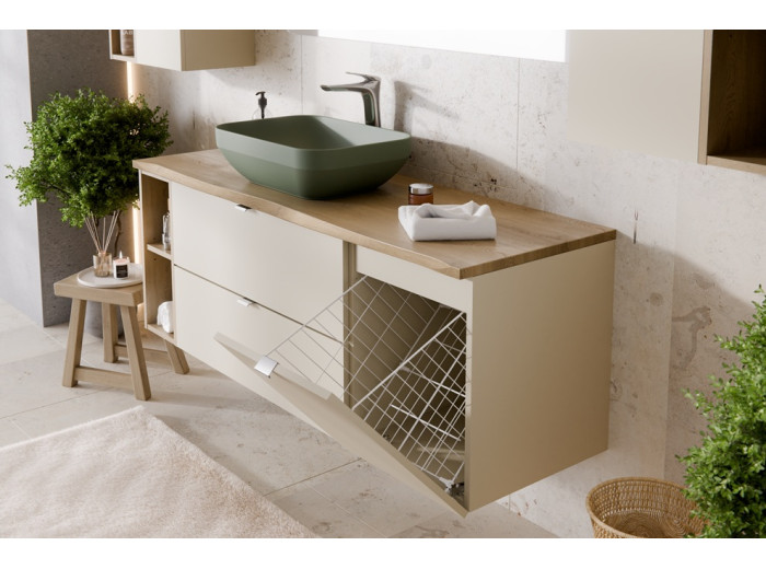 Balenie obsahuje tri varianty úchytiek: matnú čiernu, lesklú zlatú a lesklú chrómovú, vďaka čomu si môžete vzhľad skrinky prispôsobiť farbe batérie alebo iným kúpeľňovým doplnkom. Skrinka je navrhnutá na zavesenie na stenu, čo uľahčuje čistenie podlahy a zároveň vizuálne zväčšuje priestor kúpeľne. Jej hlavnou výhodou je integrovaný kôš na prádlo, ktorý diskrétne ukryje špinavú bielizeň. Vrchná doska nie je súčasťou balenia.