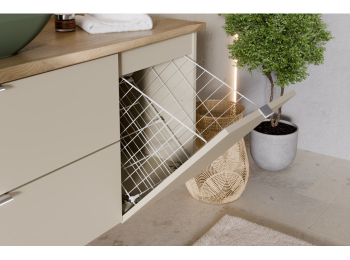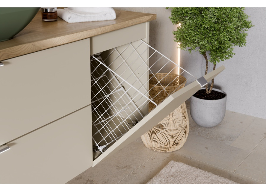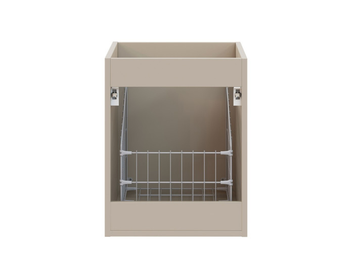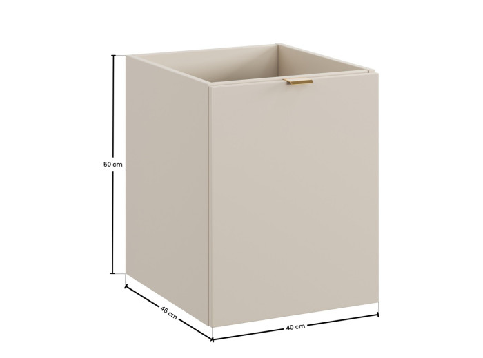 Skrinka s košom na bielizeň DALIA v odtieni cashmere je praktickým a zároveň štýlovým doplnkom do modernej kúpeľne. Kúpeľňová skrinka so šírkou 40 cm je určená na ukladanie bielizne a môžete ňou rozšíriť napr. skrinky pod umývadlo. Je vyrobená z kvalitnej laminovanej drevotriesky, doplnenej o ABS hrany, ktoré zvyšujú jej odolnosť voči vlhkosti aj mechanickému poškodeniu. Predné dvierka sú hladké, v minimalistickom štýle.