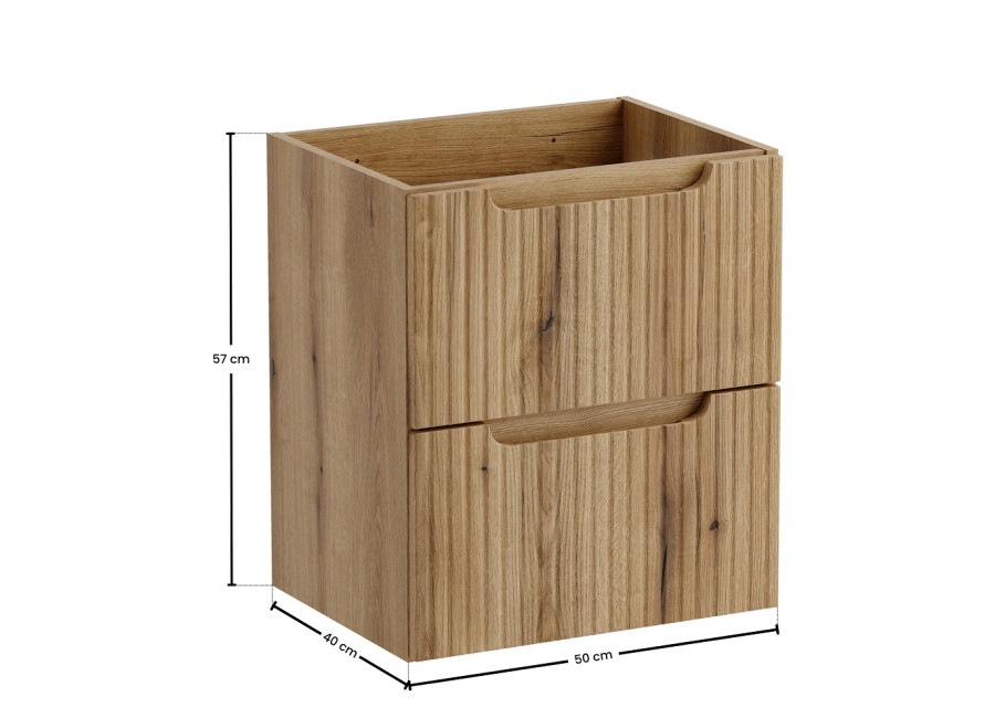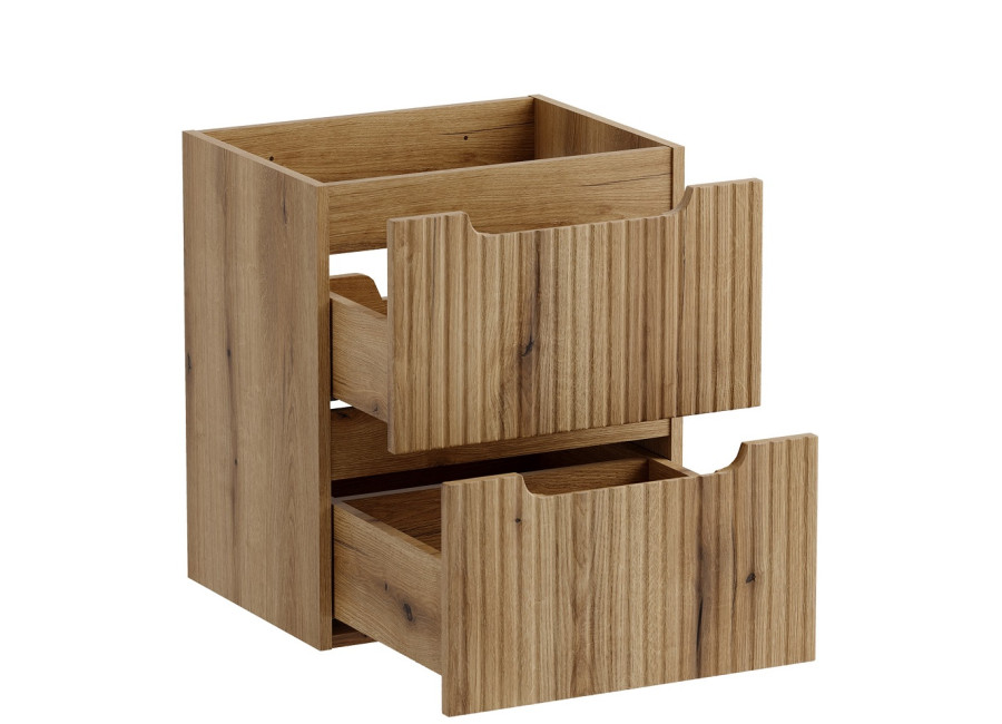 Skrinka pod umývadlo 50 cm NOVA Coast Evoke 82-50-40-2S kladie dôraz na dizajn, funkčnosť a dlhodobú kvalitu. Zaujme elegantným minimalizmom, výrazným vertikálnym drážkovaním čielok zásuviek a zafrézovanými úchytkami.