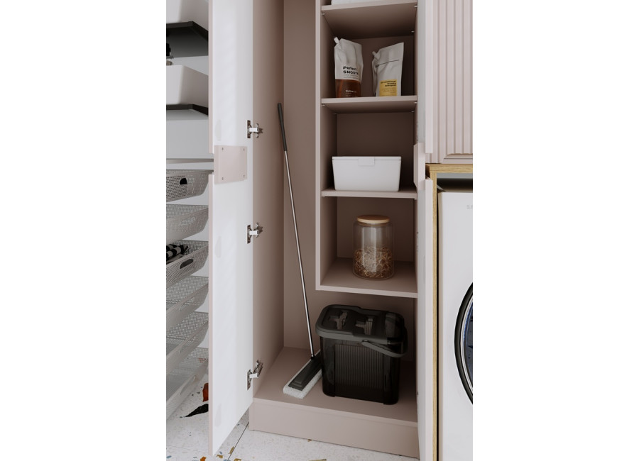 Výška skrine 180 cm ponúka štedrý úložný priestor v podobe viacerých vnútorných políc a praktickej časti vhodnej napríklad na uloženie mopu, čistiacich pomôcok alebo vyšších predmetov. Skriňa tak pomáha udržať poriadok aj v menších kúpeľniach a je ideálnou voľbou pre každodenné používanie. Vďaka vnútornému usporiadaniu si v nej nájdu miesto uteráky, kozmetika, zásoby drogérie aj domáce potreby. Použité materiály kombinujú laminovanú drevotriesku a MDF materiál. Dvierka sú vybavené systémom tichého dovierania, ktorý zvyšuje komfort pri každodennom používaní.