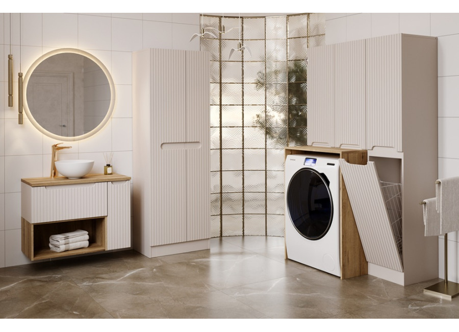 Skriňa do kúpeľne NOVA Cashmere 80-60-39 zaujme na prvý pohľad jemným vertikálnym drážkovaním, ktoré dodáva nábytku moderný charakter. Zafrézovaná úchytka je elegantne zapracovaná do dvierok a neruší celkovú líniu skrine. Farba kašmír prináša do kúpeľne elegantný vzhľad a pôsobí harmonicky v moderných aj nadčasových interiéroch. Skriňa je plne kompatibilná s ďalšími prvkami série NOVA, čo umožňuje vytvoriť jednotné a funkčné riešenie pre celý kúpeľňový nábytok.