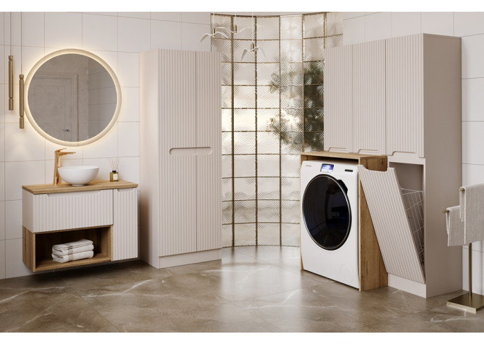 Vysoká skrinka s košom na prádlo NOVA Cashmere 80-35-1D1DK s výškou 180 cm ponúka vnútorné usporiadanie v podobe troch políc a priestranného koša na prádlo. Je navrhnutá pre zákazníkov, ktorí hľadajú funkčný kúpeľňový nábytok s čistým vzhľadom. Elegantný minimalizmus dopĺňa výrazné drážkovanie na dvierkach a zafrézovaná úchytka, ktorá neruší celkovú líniu skrinky. Jemné farebné prevedenie Cashmere pôsobí teplo a prirodzene, vďaka čomu sa skrinka ľahko kombinuje s ostatnými prvkami interiéru. V rámci série NOVA je možné skrinku zladiť aj s ďalšími dekormi a skrinkami.
