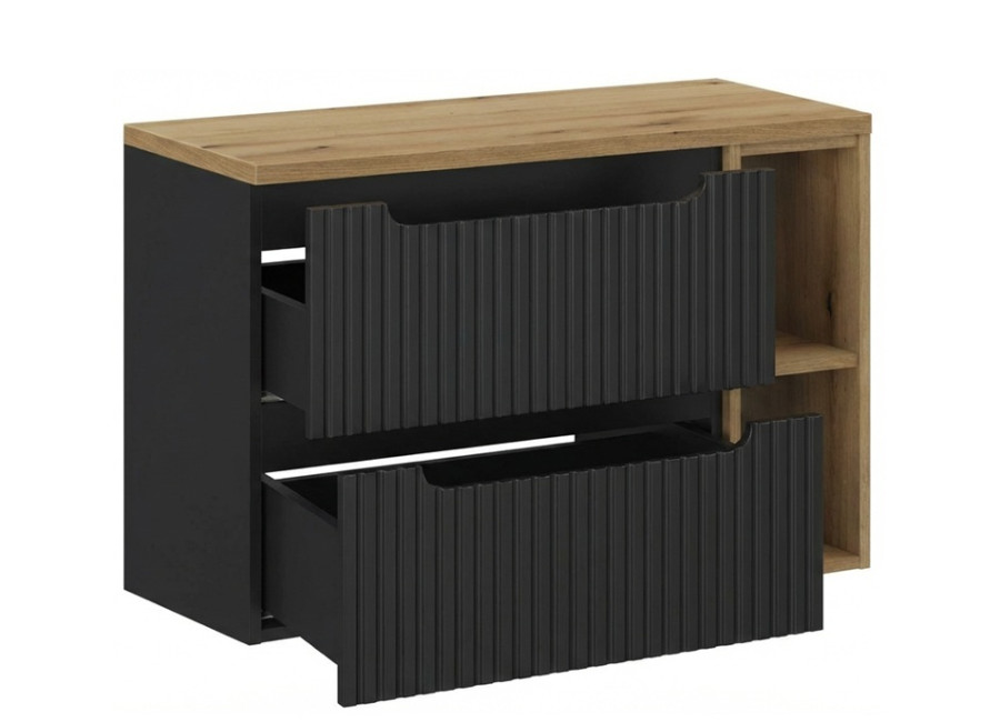 Kúpeľňová skrinka ponúka dostatok priestoru na prehľadné uloženie všetkých potrebných vecí. Zásuvky vybavené funkciou tichého dovierania sú ideálne na odloženie uterákov, čistiacich prostriedkov alebo fénu, zatiaľ čo otvorený 20 cm regál perfektne poslúži na drobnosti, ktoré potrebujete mať okamžite po ruke, ako sú parfumy, kozmetika alebo dekorácie. Skrinka je závesná na stenu, čo nielen opticky zväčšuje priestor, ale uľahčuje aj umývanie podlahy. Zásuvky majú zafrézované úchytky, ktoré podčiarkujú minimalistický vzhľad celého modelu. Ku skrinke pod umývadlo odporúčame zakúpiť plochý sifón, ktorý Vám umožní využiť hornú zásuvku na maximum.
