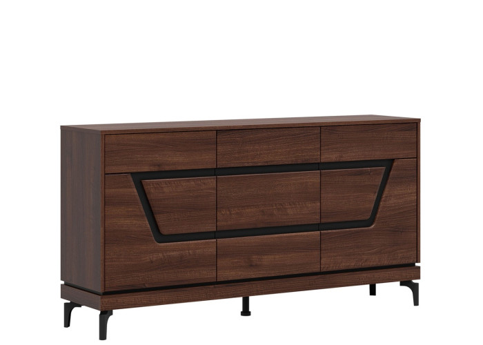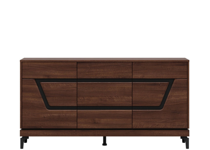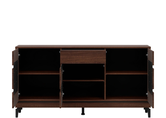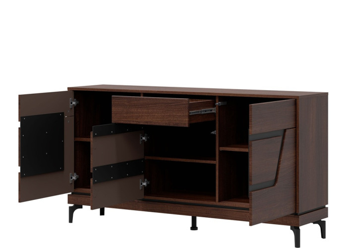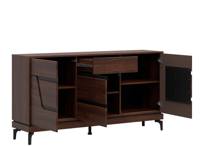 Komoda je vyrobená z laminovanej drevotriesky v hrúbke 16 mm s ABS hranami, predné plochy sú z MDF materiálu. Zásuvka s plnovýsuvom poskytuje pohodlný prístup k celému obsahu a dvierka sa otvárajú systémom Push to Open, čo prispieva k čistému a nerušenému vzhľadu čelných plôch. Farebné prevedenie je orech opera, ktoré pôsobí prirodzene a ľahko sa kombinuje s ostatným nábytkom v obývačke. Vnútorný priestor je vhodný na uloženie dokumentov, textílií, spoločenských hier, drobnej elektroniky alebo doplnkov k televíznej technike. Praktickým detailom sú 12 cm vysoké nožičky, ktoré komode dodávajú ľahší vzhľad a uľahčujú údržbu podlahy pod nábytkom pre robotické vysávače.