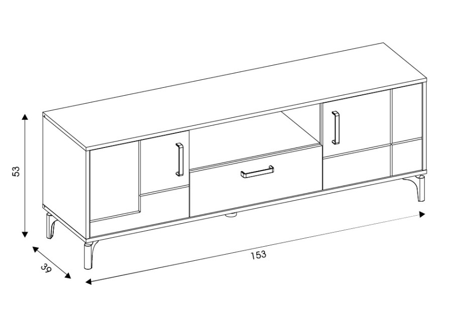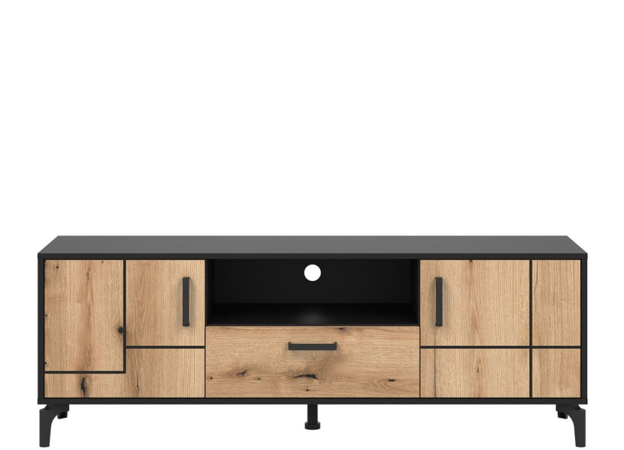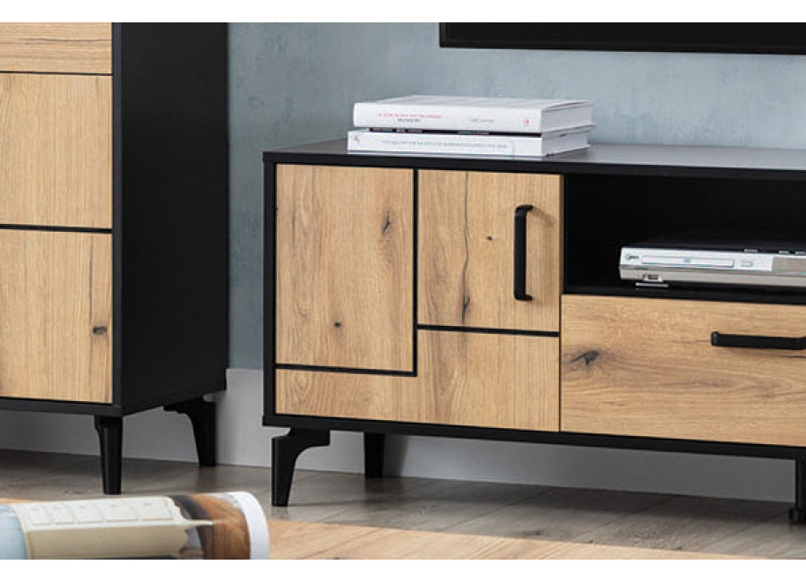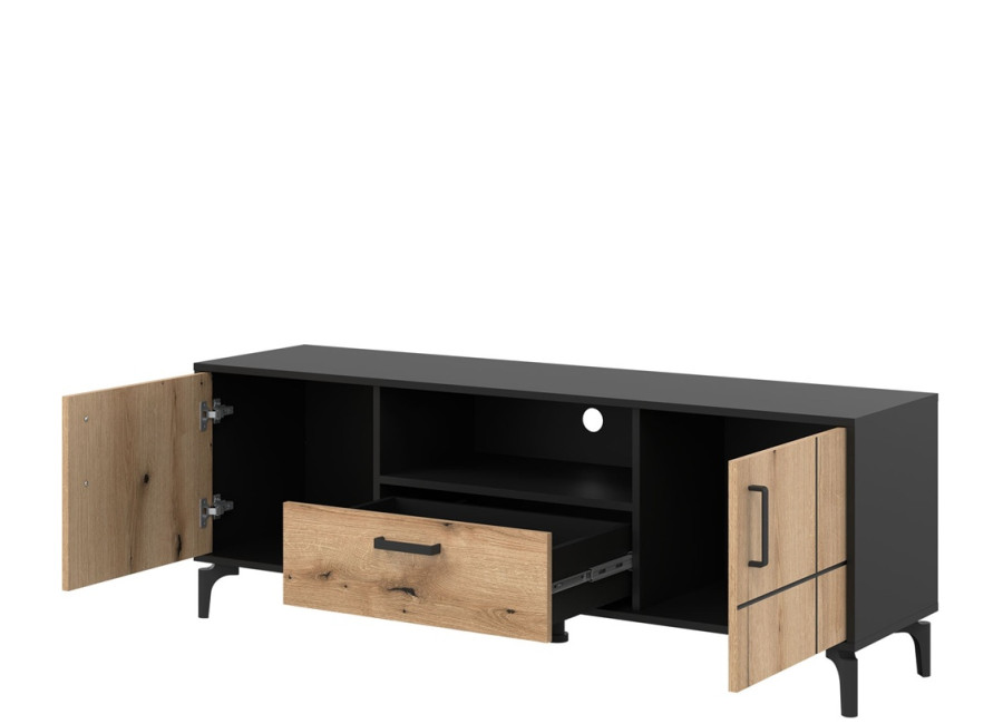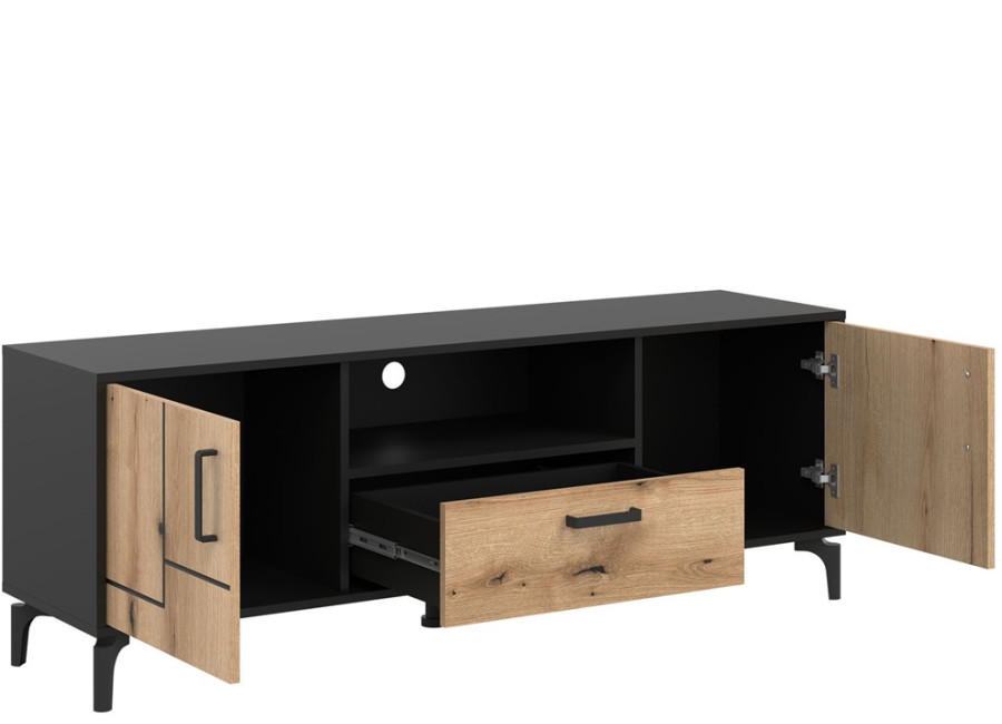Z hľadiska praktického využitia skrinka ponúka štedrý úložný priestor rozdelený tak, aby vyhovoval rôznym potrebám domácnosti. Stolík pod televízor má dvoje dvierka, jednu zásuvku a otvorenú policu, čo umožňuje prehľadné usporiadanie vecí. Otvorený priestor je ideálny na umiestnenie set-top boxu, hernej konzoly alebo inej audio a video techniky. Používateľský komfort zvyšujú moderné technické prvky, konkrétne dvierka vybavené funkciou tichého dovierania a zásuvky s plnovýsuvom, ktoré zabezpečujú plynulý prístup k celému ich obsahu.