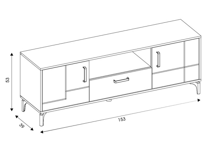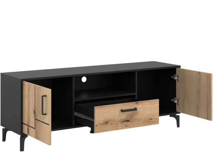 Z hľadiska praktického využitia skrinka ponúka štedrý úložný priestor rozdelený tak, aby vyhovoval rôznym potrebám domácnosti. Stolík pod televízor má dvoje dvierka, jednu zásuvku a otvorenú policu, čo umožňuje prehľadné usporiadanie vecí. Otvorený priestor je ideálny na umiestnenie set-top boxu, hernej konzoly alebo inej audio a video techniky. Používateľský komfort zvyšujú moderné technické prvky, konkrétne dvierka vybavené funkciou tichého dovierania a zásuvky s plnovýsuvom, ktoré zabezpečujú plynulý prístup k celému ich obsahu.